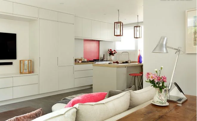 The advantage of floor-to-ceiling cabinetry that runs the length of this room is twofold: firstly, it provides a fantastic amount of storage to help you achieve that clutter-free look; secondly, it lends a clean, cohesive look to the narrow space – a subtle change in the depth and height of the units differentiates the kitchen from the living area.