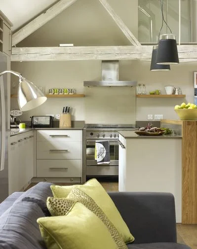 Here, a white and grey colour theme is pepped up by fresh spring greens, seen on the cushions in the sitting area and the mugs and glassware displayed on the open shelves in the kitchen.
