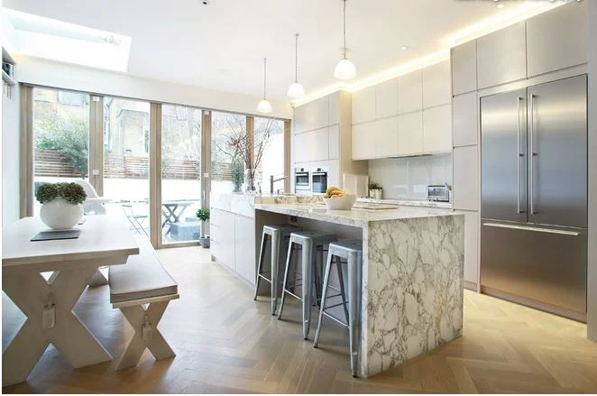 In this stunning kitchen, the marble island separates the kitchen from the dining area, allowing dinner to take place without guests crowding the host. Always position your island so that whoever is in the kitchen can work efficiently, but also keep up with the conversation at the dining table.