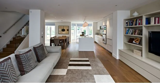 Laying wooden flooring throughout the ground floor of this family home is an excellent way of unifying different zones within a shared space. A large rug helps define the living area, injecting texture, colour and warmth.