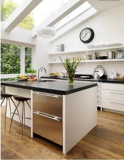 Invest in the best extractor fan or cooker hood you can afford. Firstly, if you’re planning to dine or relax in the same space as your kitchen, you don’t want your extractor hood drowning out conversation, so you’ll need a quiet model. Also, cooking smells from the kitchen are more likely to drift into the living areas in an open-plan setting. Excellent extraction is crucial for keeping them at bay.