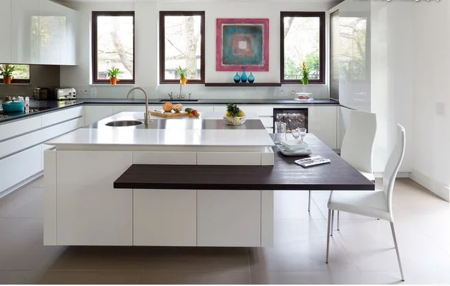 By extending the island with a table, these homeowners have created a versatile, table-height surface that can be used for everything from informal dining to chatting to the host, peeling potatoes or doing homework. It also makes kitchen seating multifunctional and saves on buying separate, high kitchen stools.