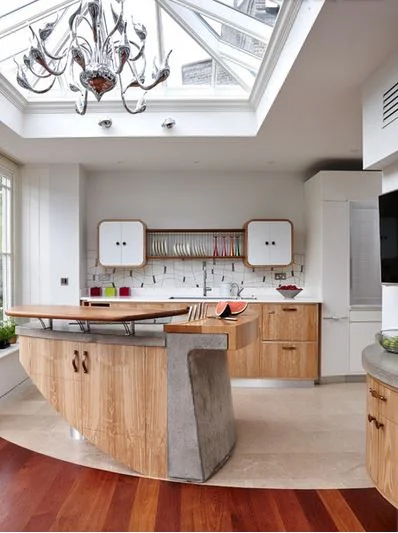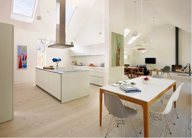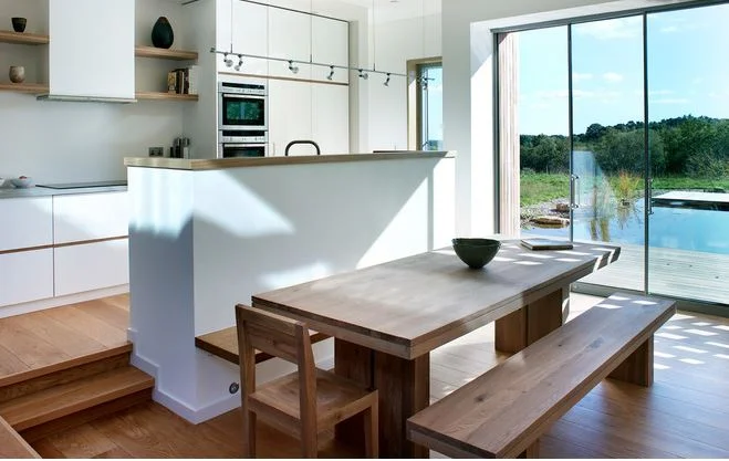 There are a number of practical ways to separate a kitchen from the dining area without banishing them to different rooms. By locating the kitchen on a slightly higher level, this space is conducive to cooking and entertaining without one impeding the other. Wooden flooring runs throughout to create a cohesive look.