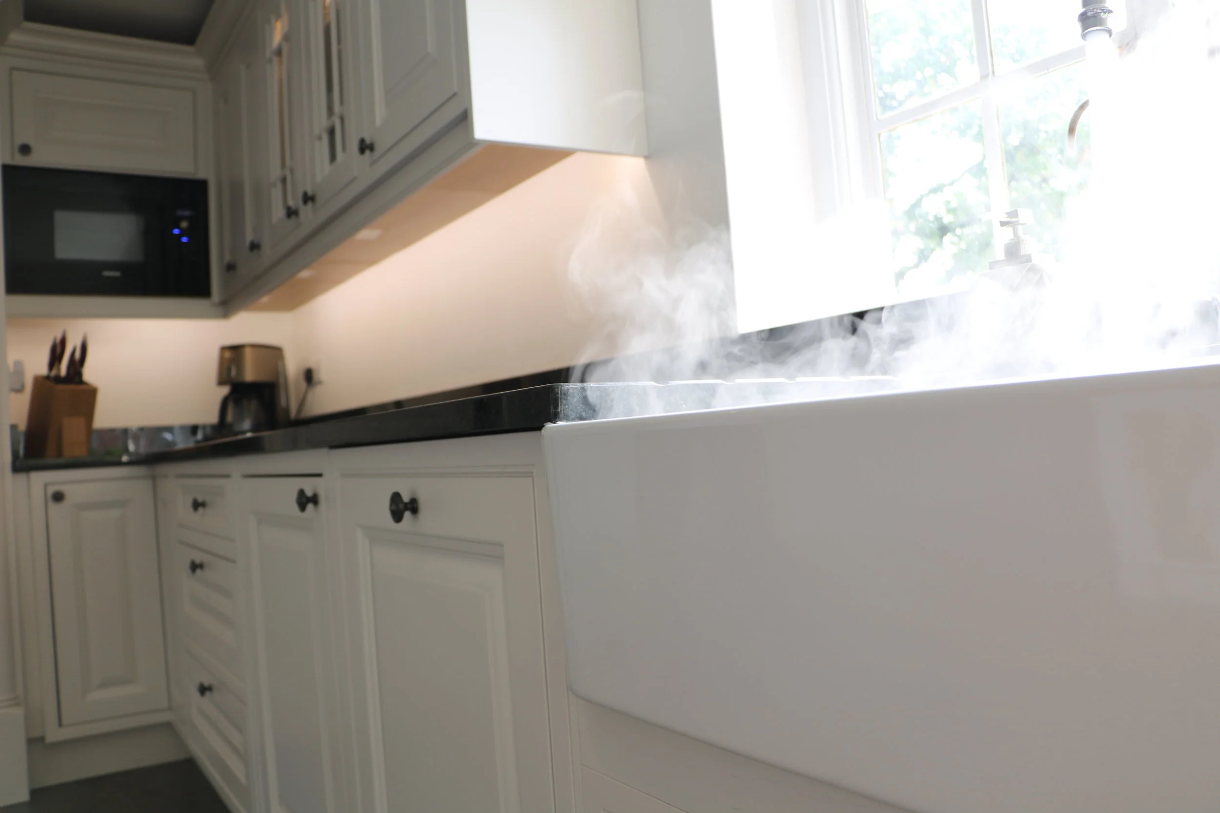 The clients wanted the kitchen to incorporate a blend of classic style but designed for modern living. They opted for an in-frame shaker style teamed with luxury black granite worktops and upstands finished with warm LED lighting. The room benefits from a beautiful vista across the garden and is the hub of this beautiful home.