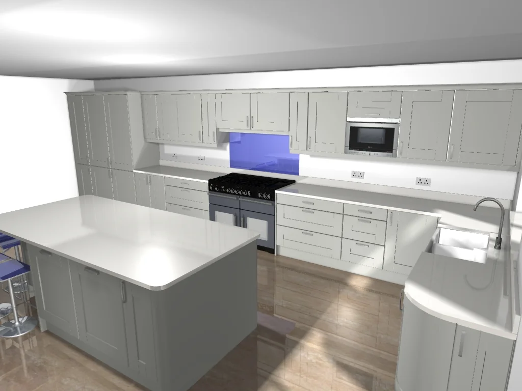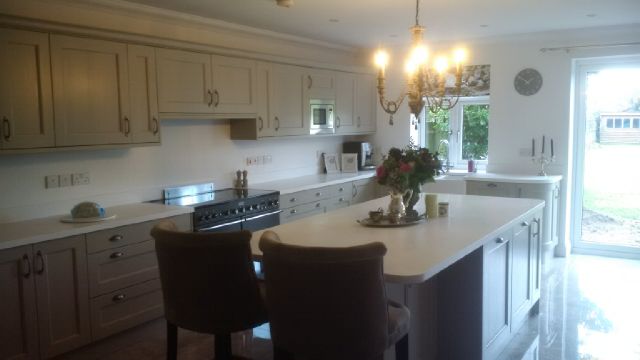 This newly-wed couple wanted their kitchen to reflect their taste for elegant design. The simplicity of the beaded shaker has a enduring appeal when coupled with white Corian worksurfaces. The island unit was designed to allow seating for 4.